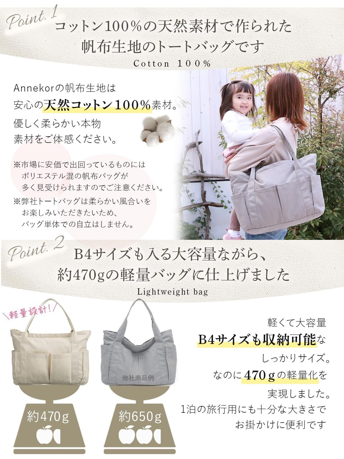 【コットン100%の帆布生地】Annekorのキャンバストートバッグは素材にこだわった結果、安心な天然コットン100%の帆布生地を使用しております。市場で多く流通している安価なポリエステル混の帆布素材よりも、軽量で肌触りの良い生地を厳選させていただきました。