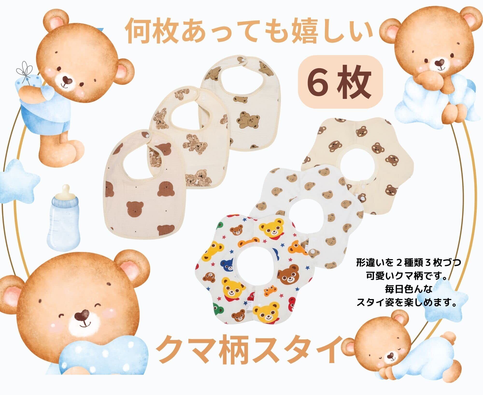スタイはコットン素材で、赤ちゃんに優しい素材になっています。花型のスタイは綿100%こちらも肌触りが良いです。全て可愛いクマ柄になっています
