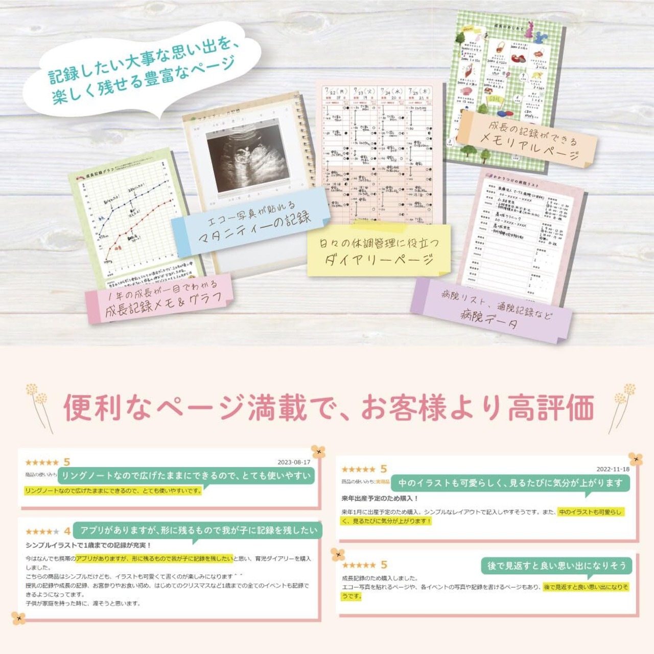 かわいいイラストたっぷりの育児ダイアリー。 誕生から1歳になるまでの成長記録に加え、赤ちゃんとの思い出を楽しく残せるページも付いています。