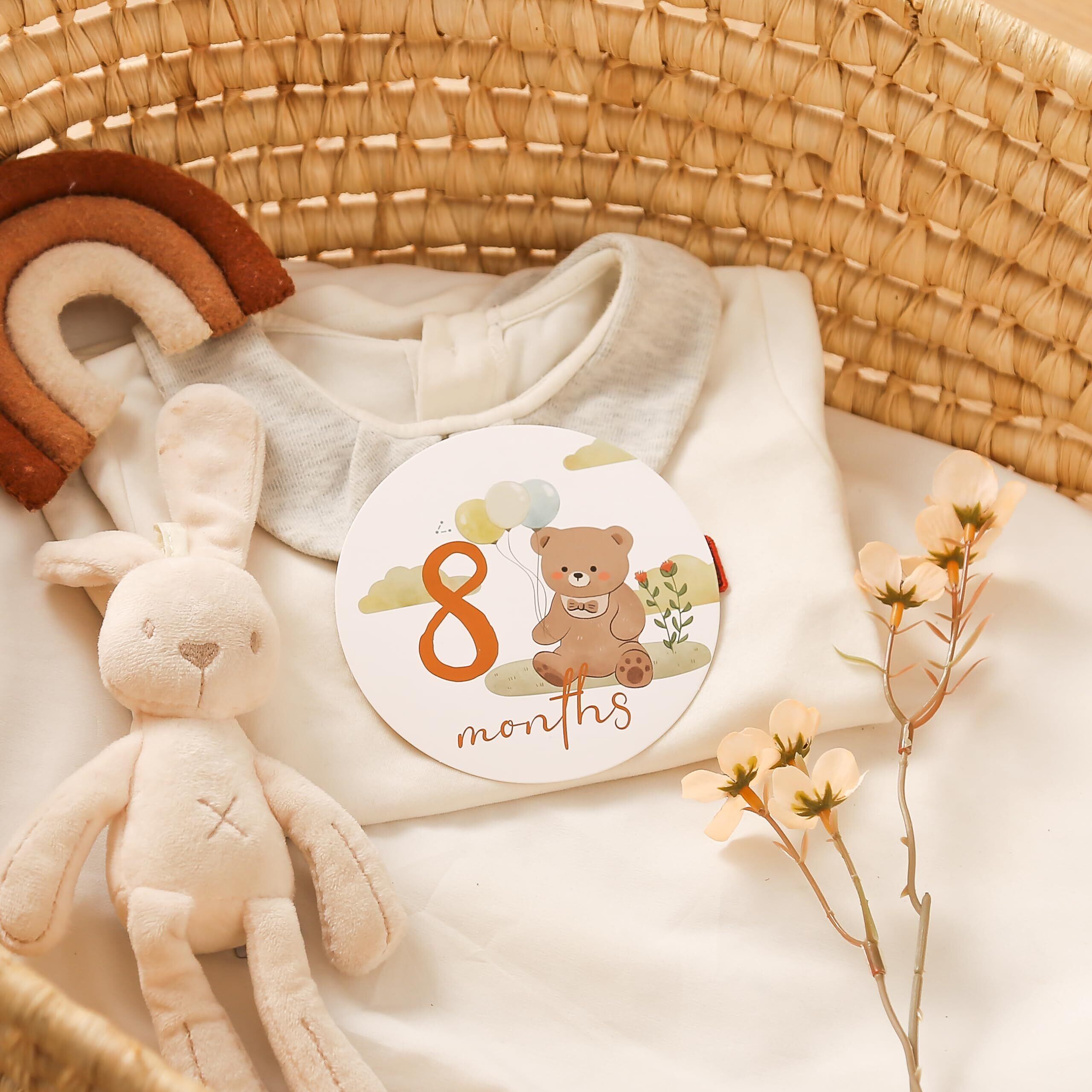 【デザイン】色合いが可愛くて、出産前の準備におすすめです。数字だけではなく、可愛いクマちゃんもよく映えます!裏面には空白のデザインなので、その時のお子様の様子や出来事なども記入できます。