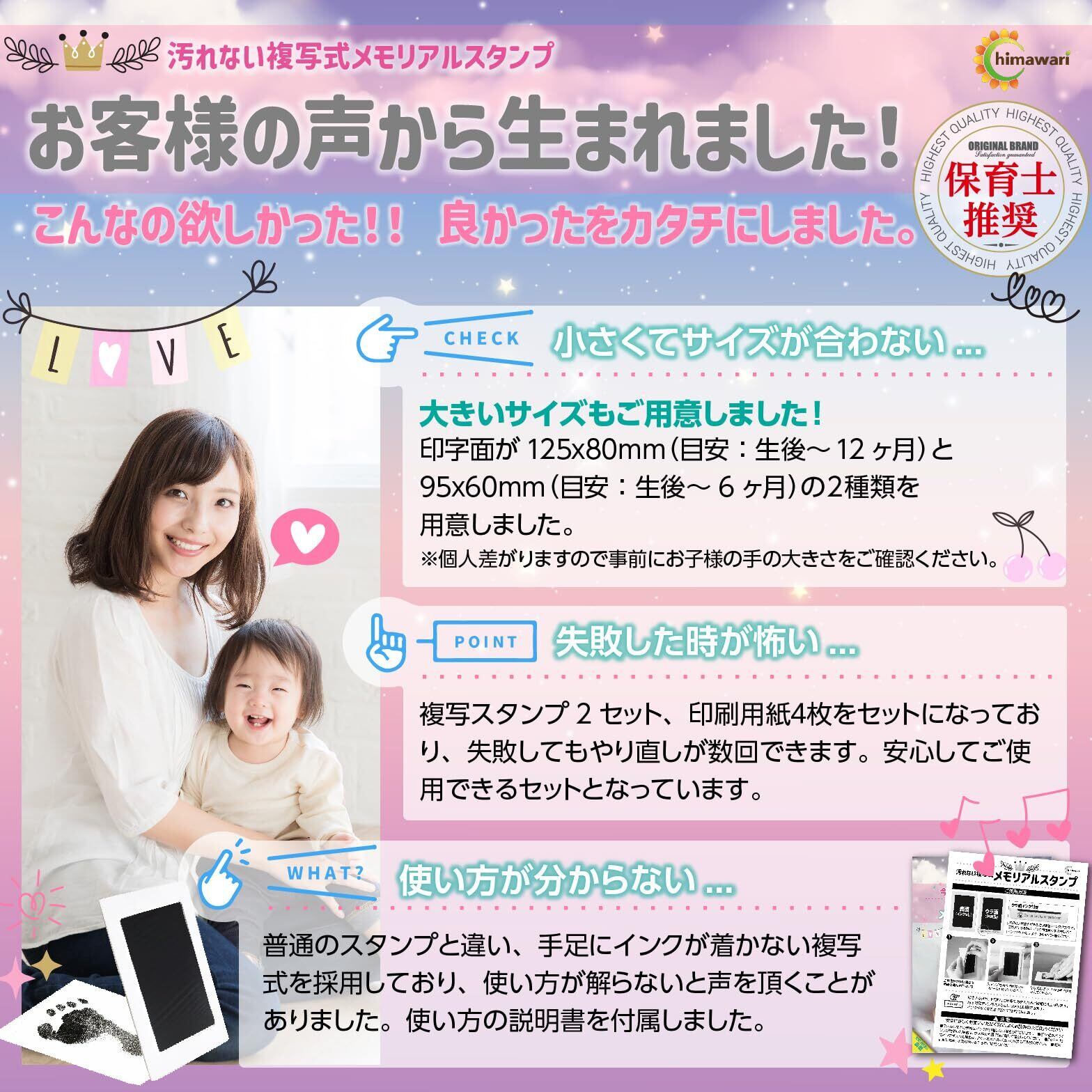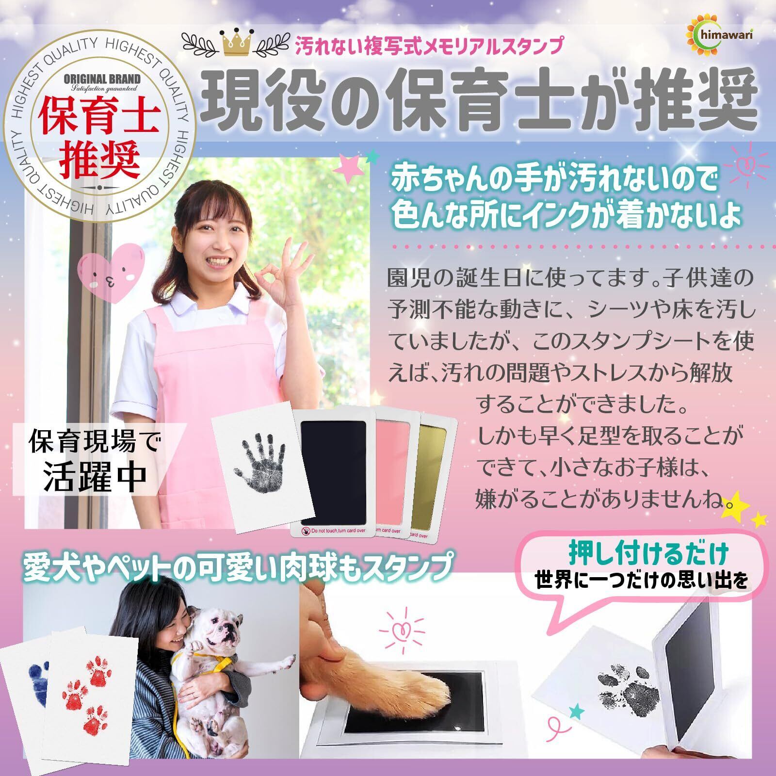 【手が汚れない】特殊用紙を使用する事で手を汚すことなく手形・足形が取れます。お子さんの機嫌を損なう事なく手形・足形をとる事ができます。お子さんだけでなくペットにも使用できます。
