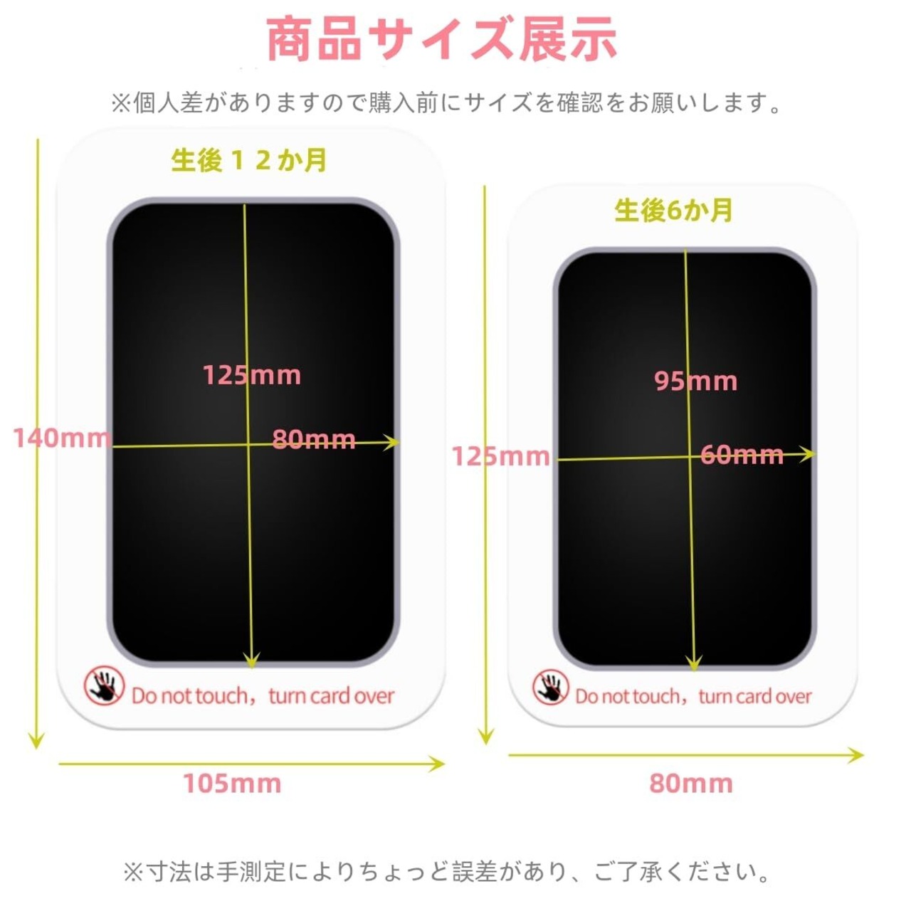 【パッケージ内容】インクパッド*2枚+インプリントカード*4枚。サイズM:印刷面縦9.5cm、横6cm(生後6か月)、サイズL:印刷面縦12.5cm、横8cm(生後12か月)2サイズで個人差により選択サイズを選択可能です。