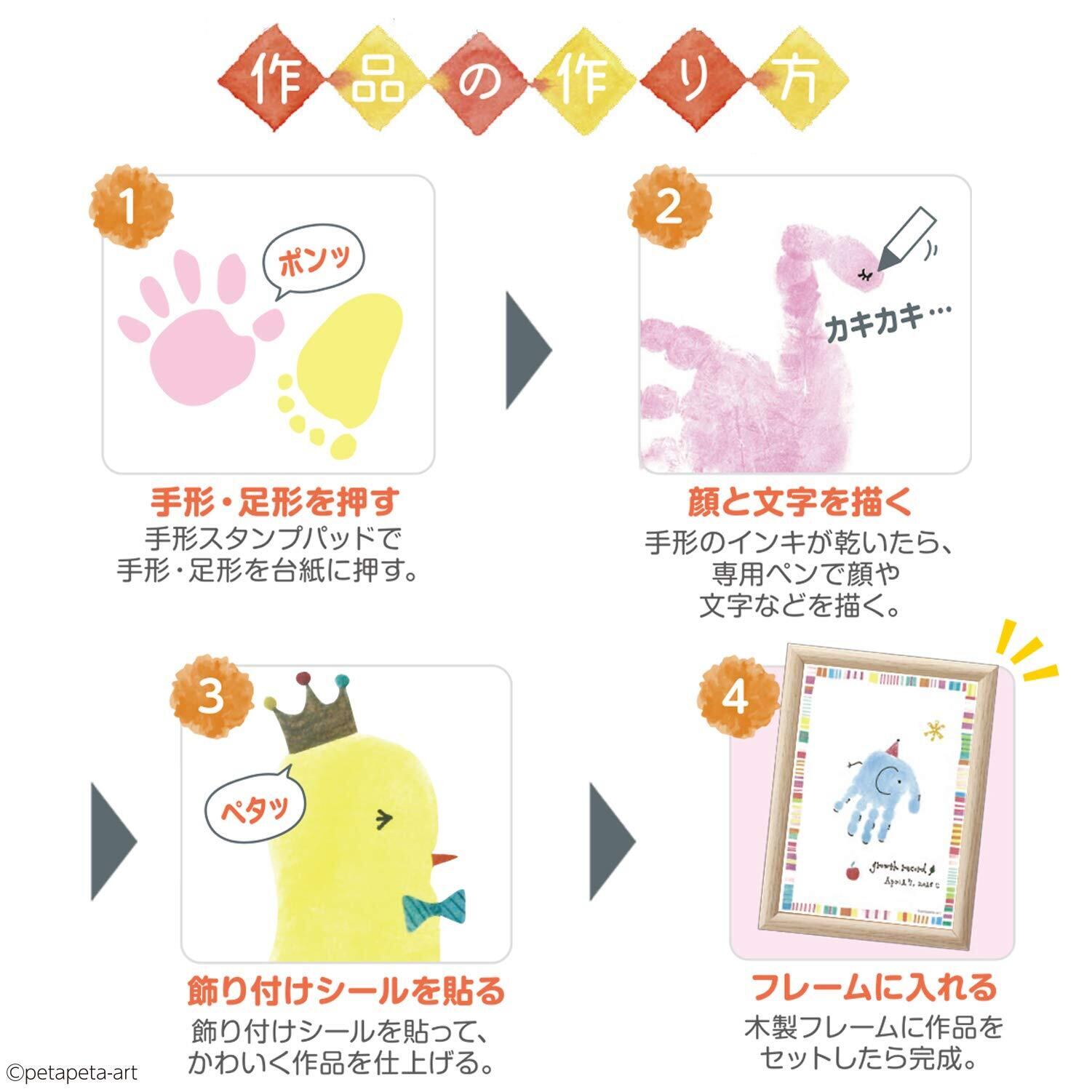【セット内容】手形スタンプパッド(PALM COLORS)2色、木製フレーム1面、作品用台紙3枚、飾り付けシール3作品分、飾り付け専用ペン1本(黒)