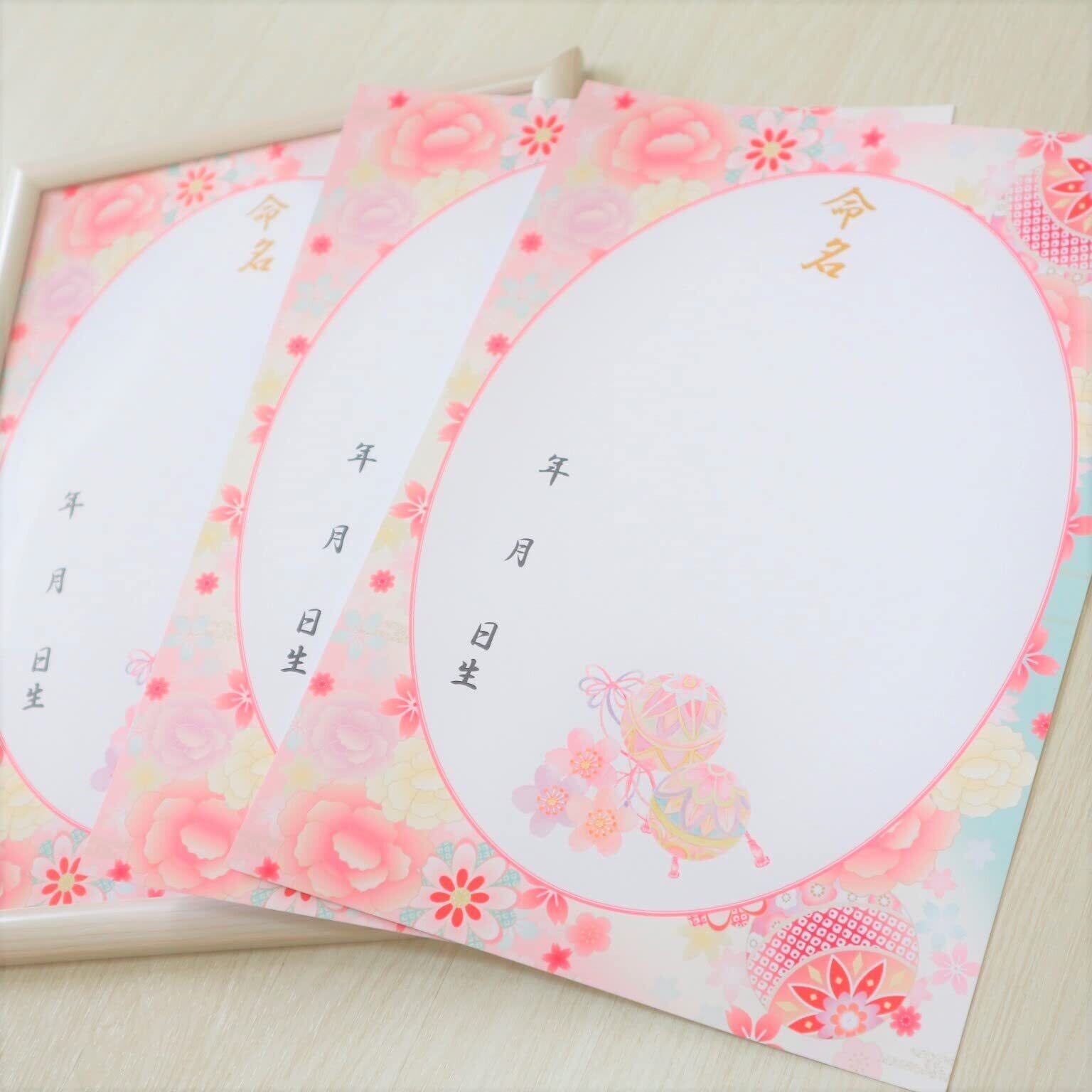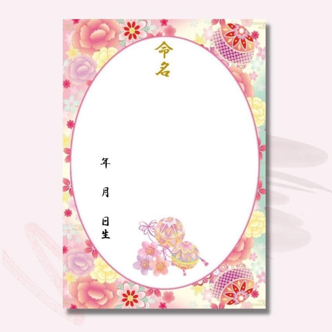 【在庫処分】《命名紙3枚セット》毬と牡丹~桃色~ A4和風命名用紙 万が一の書き損じにも安心の3枚入 額なし ご縁を結ぶリボンに縁起の良い毬と牡丹が優しいパステルカラーデザイン 令和6年 令和7年生まれのお子様 命名書 命名紙 お七夜 出産祝い 命名式 縁起の良い毬と牡丹 命名紙 日本製 MMS005-MM | jake