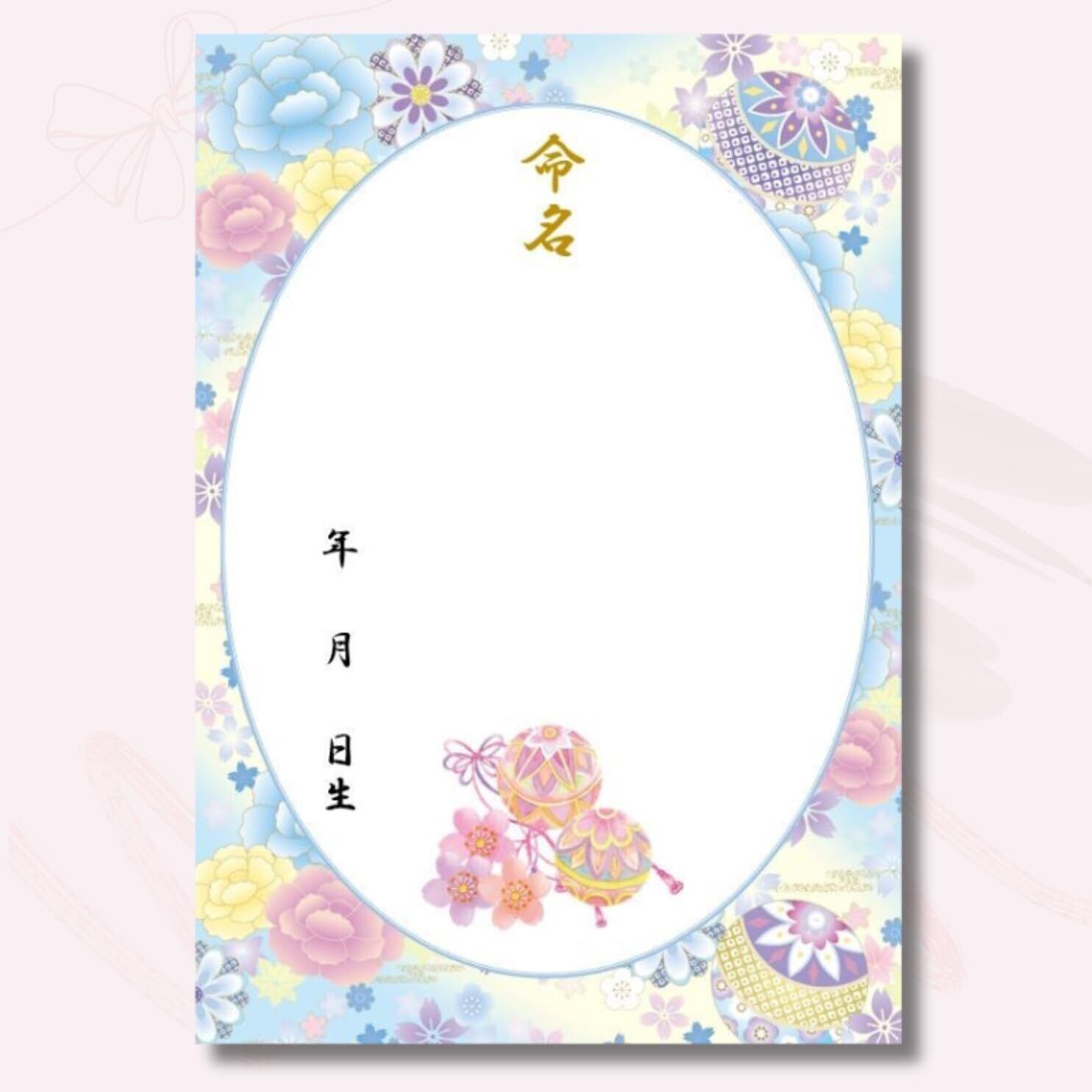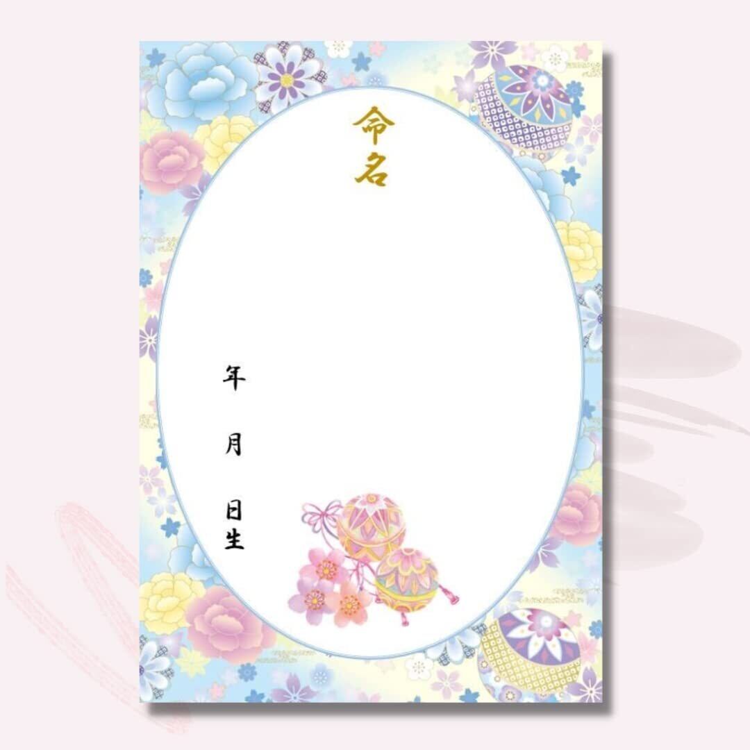 《命名紙3枚セット》毬と牡丹 水色 和風命名用紙 書き損じにも安心の3枚入 額なし 令和生まれのお子様 命名式 縁起の良い毬 出産祝い お七夜 命名式 命名書 命名用紙 男の子 女の子 優しいパステルカラー日本製 MMS007-N