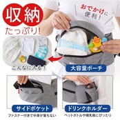 <その4.ウエストガードクッション>腰ベルト内側のおなかに当たる部分はクッション仕様になっているので、ママパパのお腹への負担を軽減します。 <その5.幅広ベルト>しっかりしっかり13.5cmの幅広ベルトが体重を分散させ腰負担を軽減。 <その6.座面クッション>赤ちゃんが座ったときにお尻が痛くならないようにクッションをしっかり詰めました。 <その7.便利な収納ポケット付き>正面には大容量サイズのポーチ、サイドにはちょっとした小物を入れておける収納ポケットとドリンクホルダー付き!