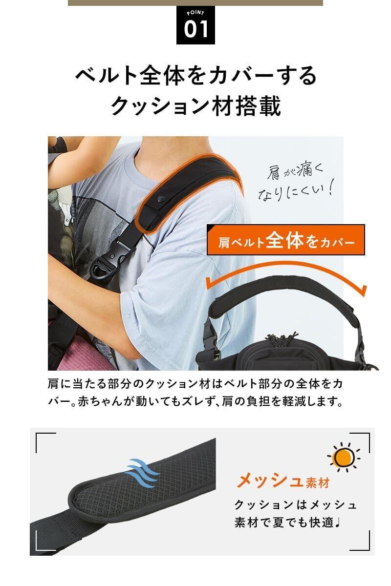 ベルト全体をカバーするクッション材搭載 肩への負担を軽減する幅広クッション設計。夏でも快適なメッシュ素材を採用。